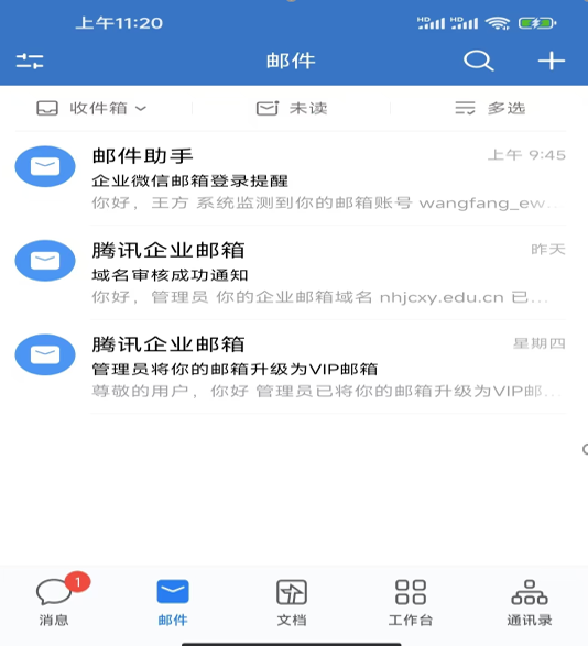 2、手机端:通过企业微信APP——邮件,直接使用。