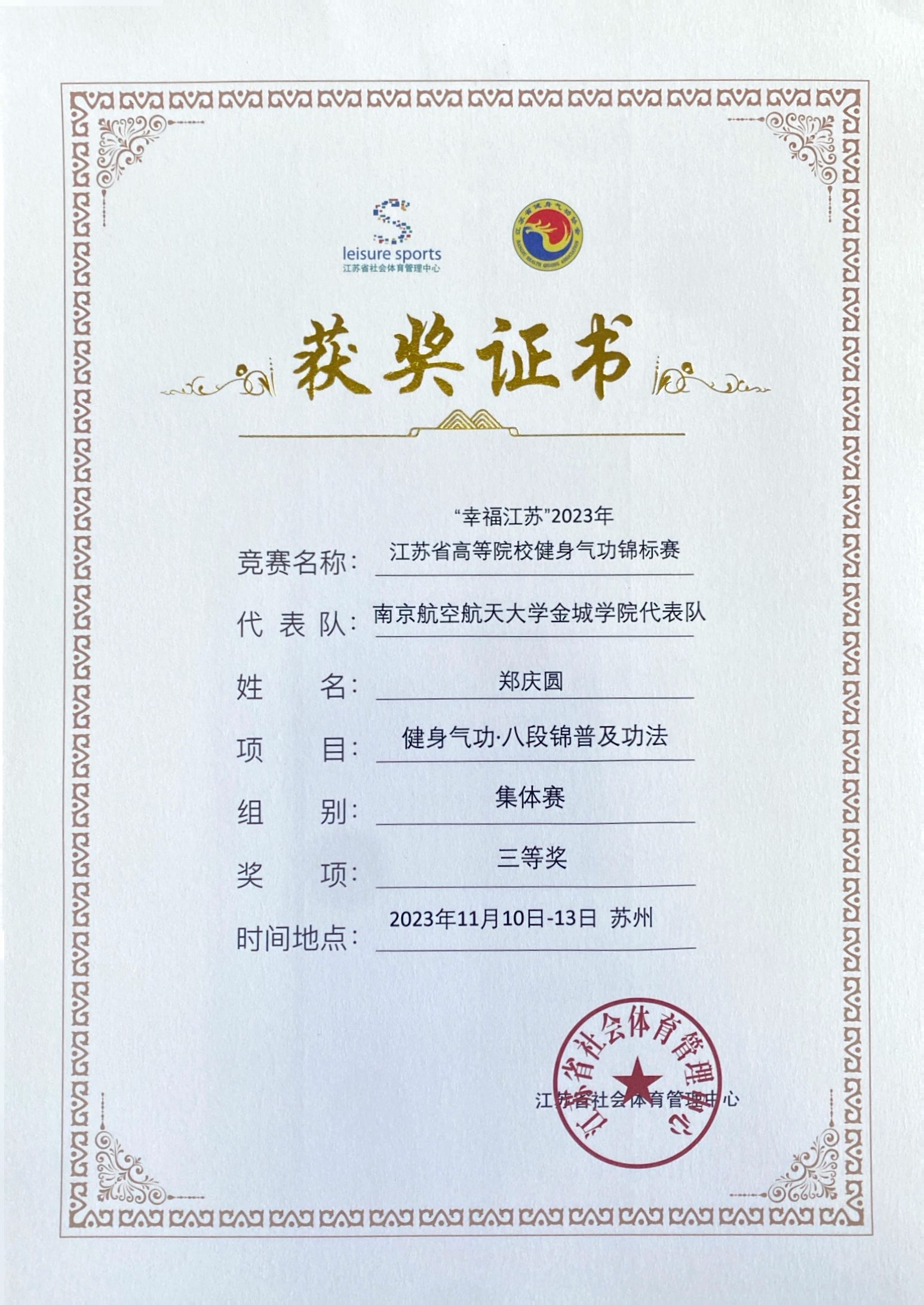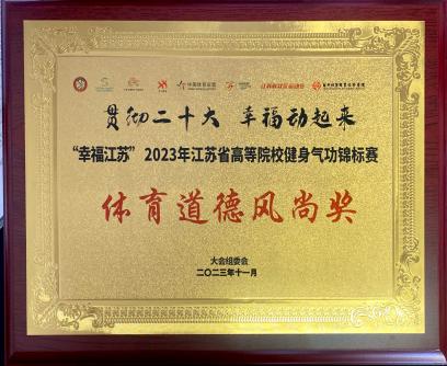 11月10日至13日,由江苏省社会体育管理中心、苏州市体育局主办,江苏省学生体育协会大学生健身气功分会等单位承办的以“贯彻二十大 幸福动起来”为主题的“幸福江苏”2023年江苏省高等院校健身气功锦标赛于苏州经贸职业技术学院圆满闭幕。