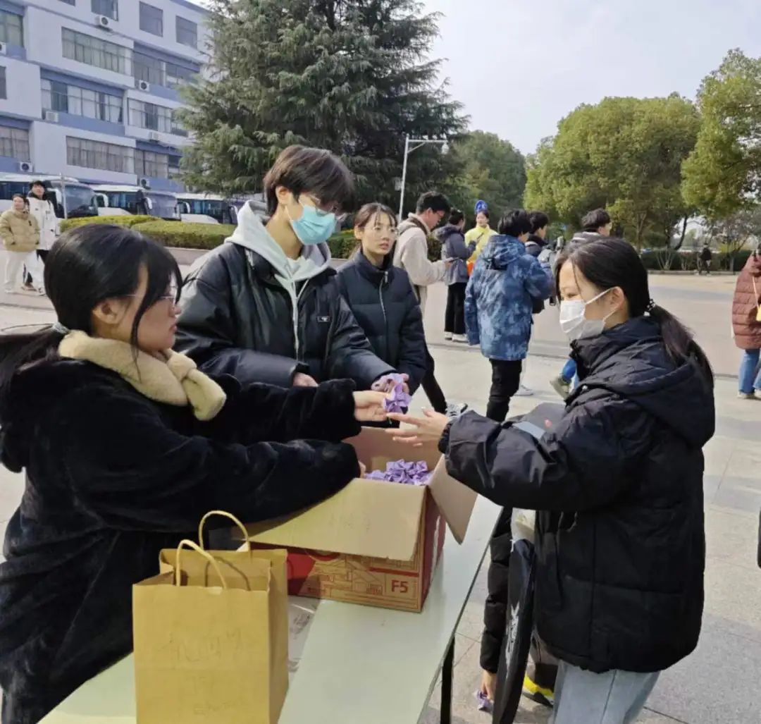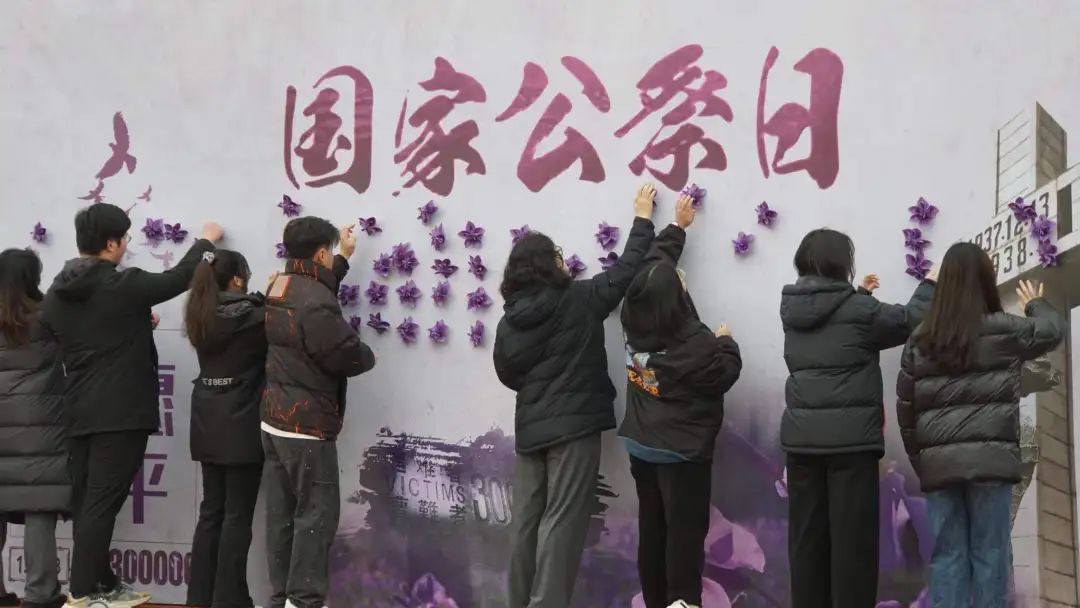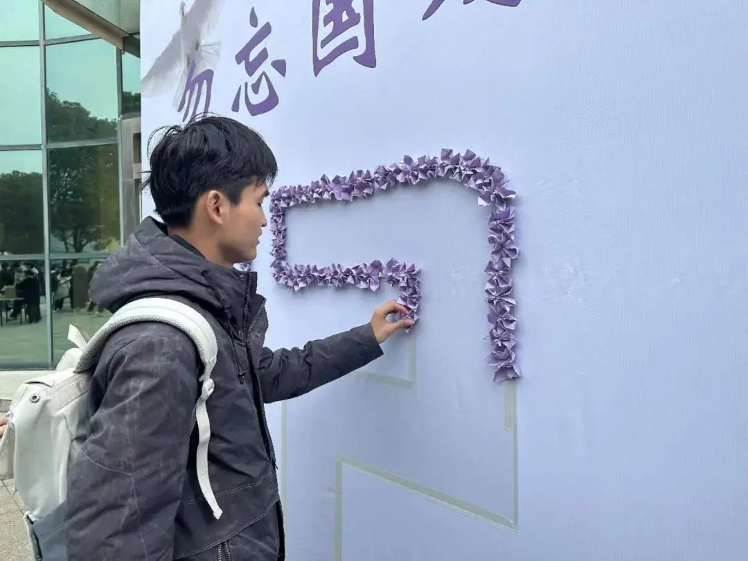 12月13日,国际商学院举行了“铭记历史,勿忘国耻”国家公祭日主题活动。同学们通过在大喷上张贴卡片留言,折纸花来缅怀遇难同胞。同时,志愿者给同学们发放紫金草微章、贴纸,宣传讲解紫金草的意义:一朵紫金草,守望和平路。