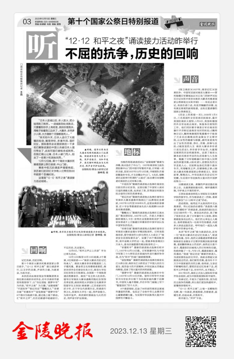 第十个国家公祭日前夕,“12·12 和平之夜”接力诵读举行,以文字的灵魂、声音的力量,为逝者哀,为和平祈,机自院红宣会的同学作为此次接力诵读活动的诵读人员参加了本次活动。本次活动由南京报业传媒集团周末报社联合南京诗词学会,在中共南京市委宣传部指导下,以“勿忘国耻 圆梦中华”为内容,“和平之夜”为主题,“金陵城殇”“不屈抗争”“铭记历史”“警醒后人”“吾辈自强”“祈愿和平”“奋发图强”“圆梦中华”8个部分为线索片段,通过线上线下联动,汇“和平之声”,在历史痛感中砥砺前行,不忘历史,矢志复兴。