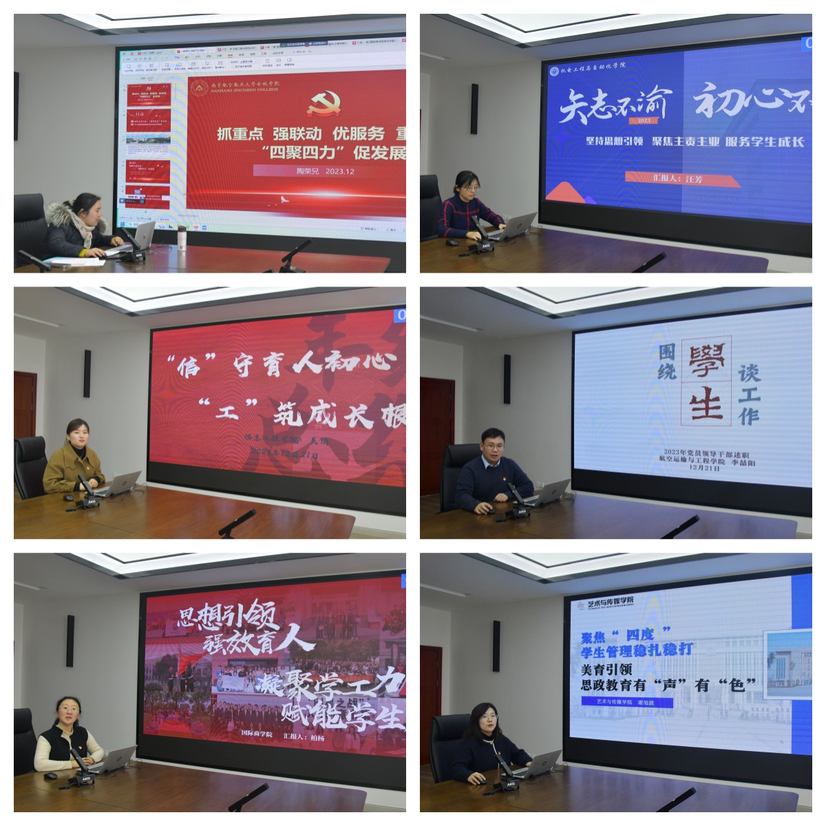 党群工作部部长和5位二级学院副书记汇报了2023年的工作开展情况和取得的业绩,深刻剖析工作中存在的问题和不足,同时提出下一步的改进措施和工作思路。大家表示,要进一步主动担当作为,守好一段渠,管好责任田,集中精力、统筹安排、扎实推进工作落实,与学院发展、学校发展“同频共振”。