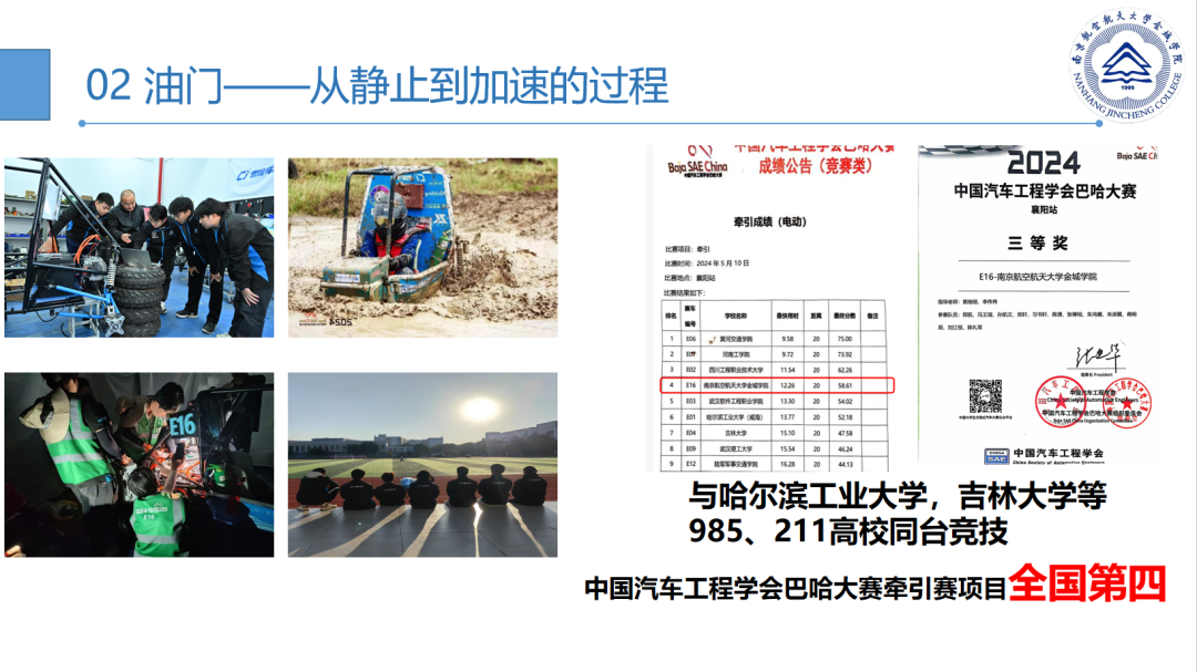 记得比赛的前一天,赛车因不符合赛规需要连夜修改电气回路。那时的心情可以用“绝望”两个字来形容,但我从来没有想过放弃。我和队友们通宵达旦,终于连夜完成了调整。虽然疲惫,但那是我们见过最美的日出。最终在与一众985、211高校同台竞技下,在牵引赛项目中获得了全国第四名的成绩。