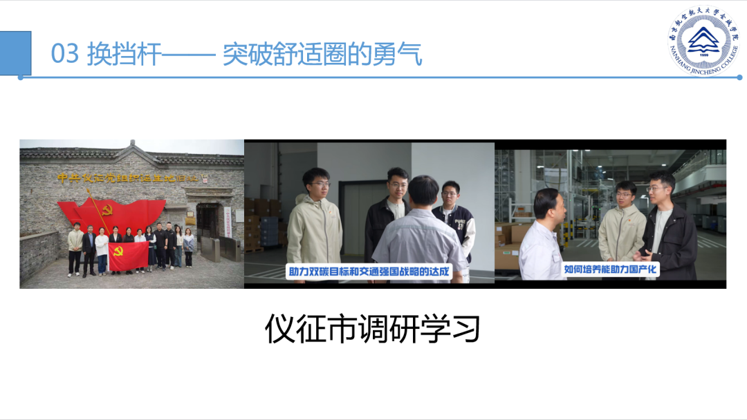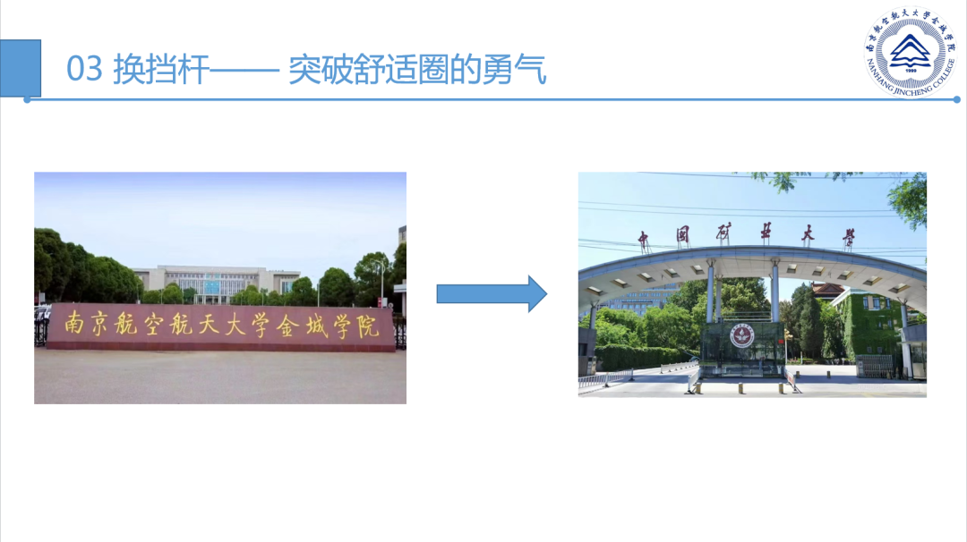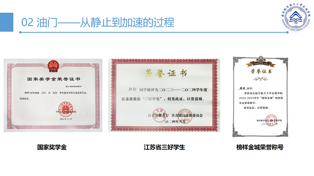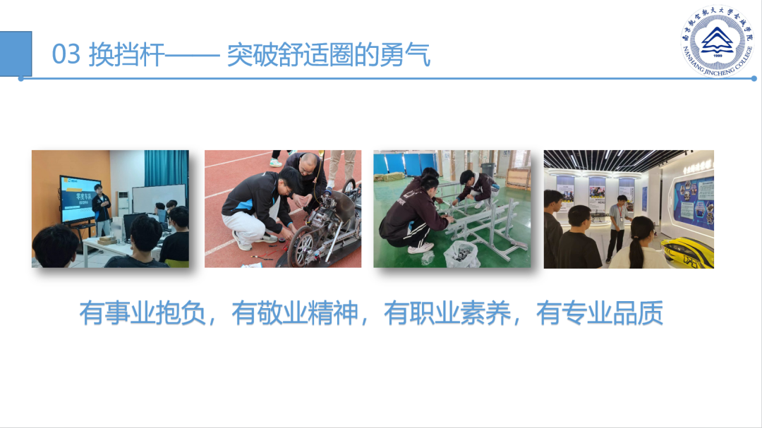 回望这段旅程,今天我有幸站在这个舞台上,和学校四有四业的培养目标是分不开的,做一个有敬业精神、有专业品质、有事业抱负、有职业素养的人,一直是我努力的方向,也引领着我在大学里如何把稳方向盘,掌握油门、在合适的时机换挡。 希望学弟学妹们也能围绕学校四有四业的培养目标,拥抱科技变革,找到自己的奋斗目标,未来我也会带着南航金城赋予我的这份力量,继续勇敢追梦,去拥抱更广阔的天地!
