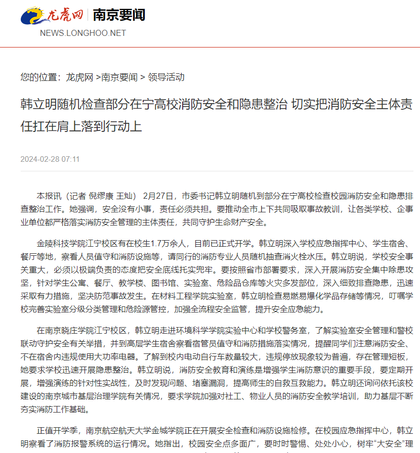 【龙虎网】韩立明随机检查部分在宁高校消防安全和隐患整治 切实把消防安全主体责任扛在肩上落到行动上