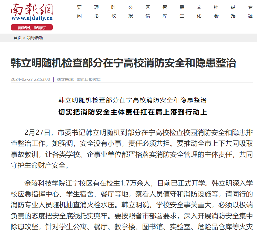 【南报网】韩立明随机检查部分在宁高校消防安全和隐患整治