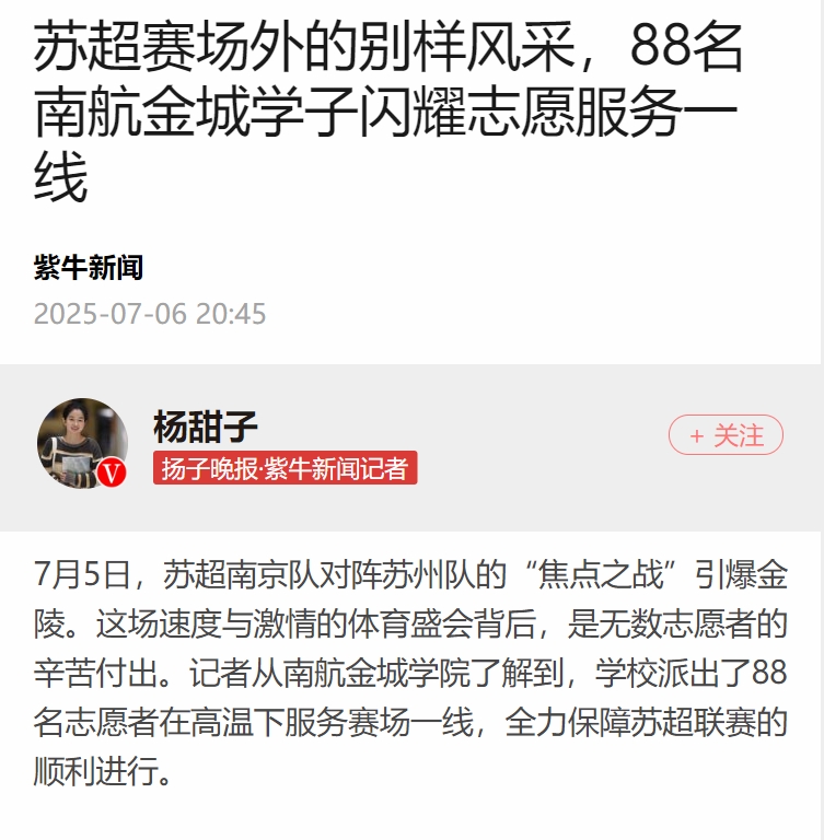 【扬子晚报】苏超赛场外的别样风采!88名金城学子闪耀志愿服务一线