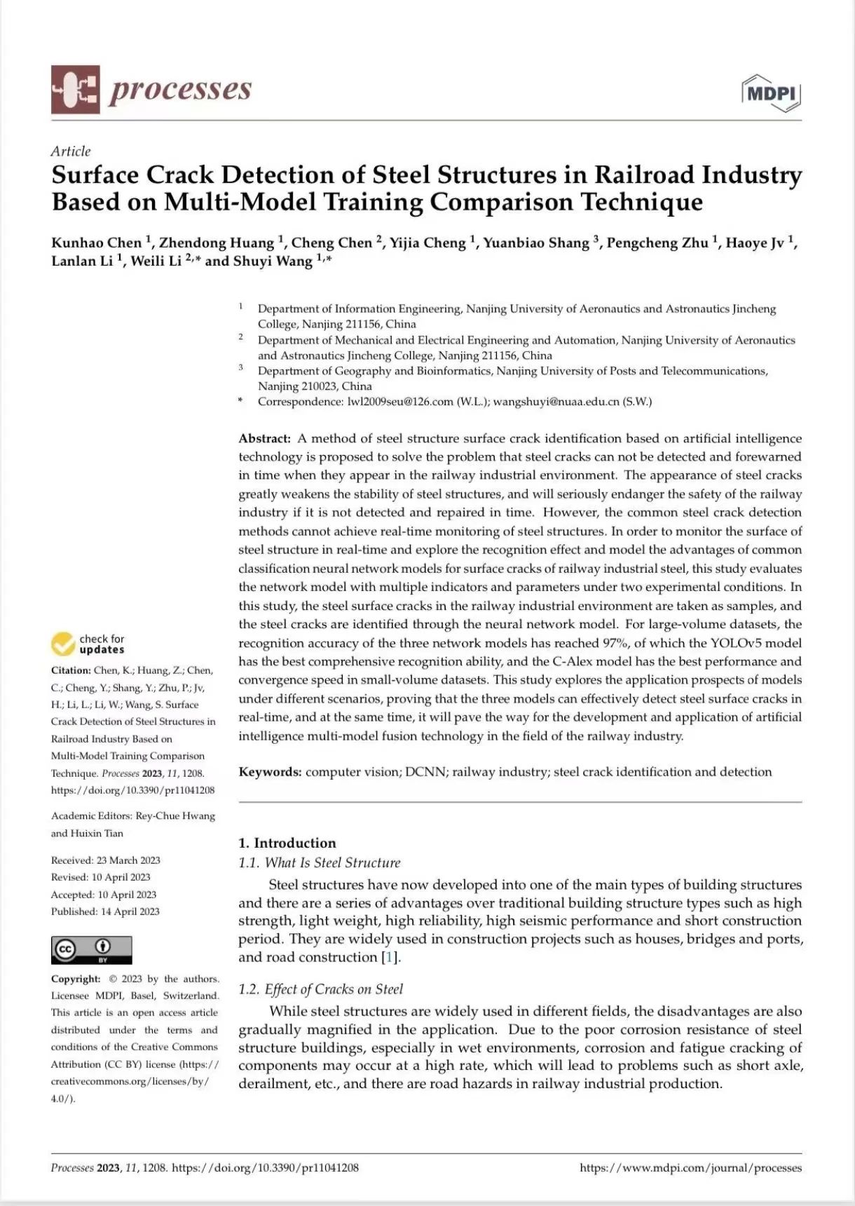 不计辛勤一砚寒,英才济济笑开颜。信息工程学院软件工程专业大四学生陈琨昊,以学生为第一作者,金城为第一单位,在《Processes》期刊发表论文《Surface Crack Detection of Steel Structures in Railroad Industry Based on Multi-Model Training Comparison Technique》,成为学校第一位在SCI期刊上发表论文的学生。他的这一突破性成绩的取得离不开机电工程与自动化学院李卫丽老师的不辞辛劳的倾囊相授。学校新闻中心的记者专访了李卫丽老师,带大家了解“南航黄色漫画 学生第一篇SCI论文”背后的故事。