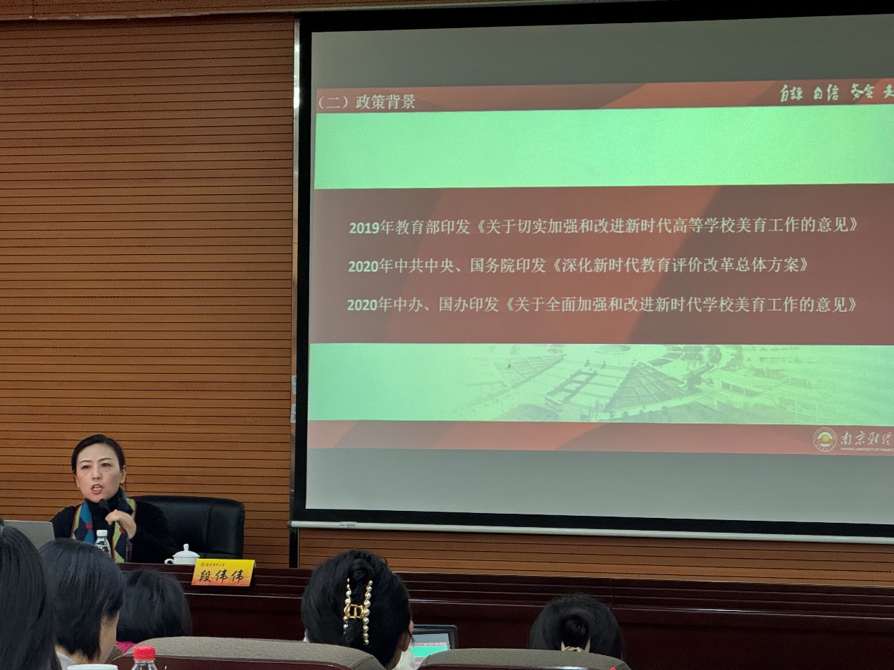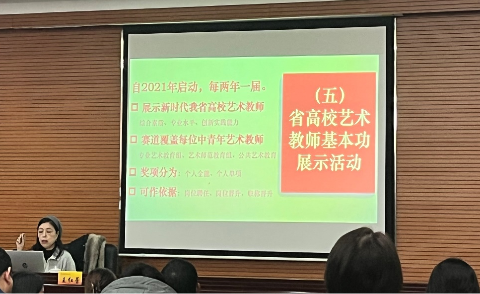 本次培训由江苏省教育厅体卫艺处副处长王红蕾拉开序幕。王红蕾 首先对教育部《高等学校公共艺术课程指导纲要》进行了全面解析,介绍了高校公共艺术教育前沿及发展动态,探讨了公共艺术课程实施的有效方式和途径。