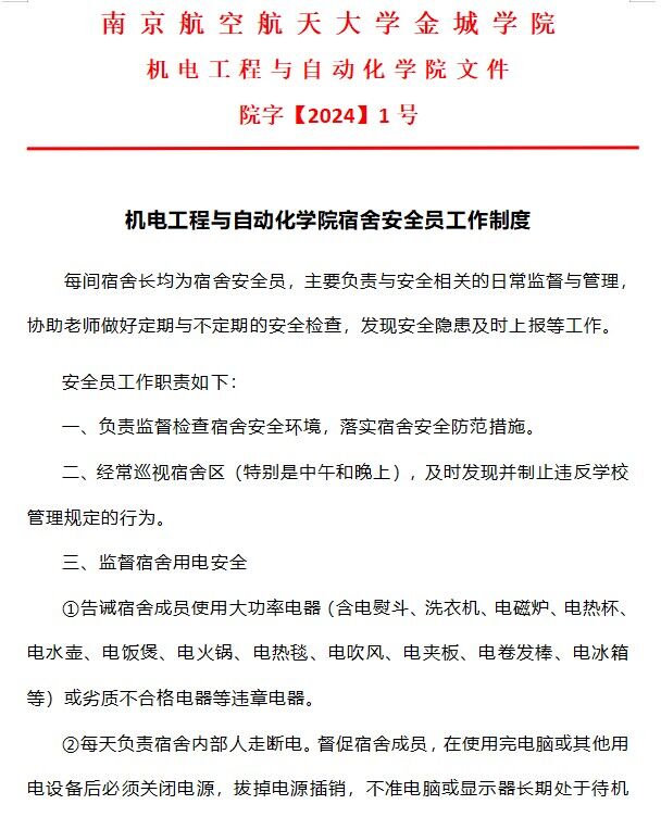 3月20日,机电工程与自动化学院党总支书记田晋、副书记汪芳带领全体辅导员在学院建立宿舍安全员制度,提高学生自我管理意识。指定宿舍长为安全员,要求安全员们对宿舍异常情况和舍友的异常表现准确感知、及时报告。辅导员对安全员所反馈的信息严肃对待,并在第一时间果断采取有效措施,防患于未然,确保宿舍安全稳定。
