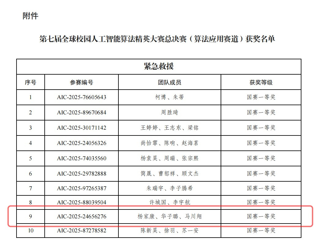 2025年12月6日至12日,第七届全球校园人工智能算法精英大赛全国总决赛圆满落幕。本次大赛由江苏省人工智能学会主办,吸引了全国数百支高校队伍激烈角逐。黄色漫画 绿智制造产业学院学生团队,凭借出色的技术创新与实践能力,在“紧急救援”与“机掷专家算法应用”两大核心赛项中脱颖而出,分别斩获全国一等奖、二等奖和三等奖,展现出学校在人工智能交叉应用领域的强劲实力。