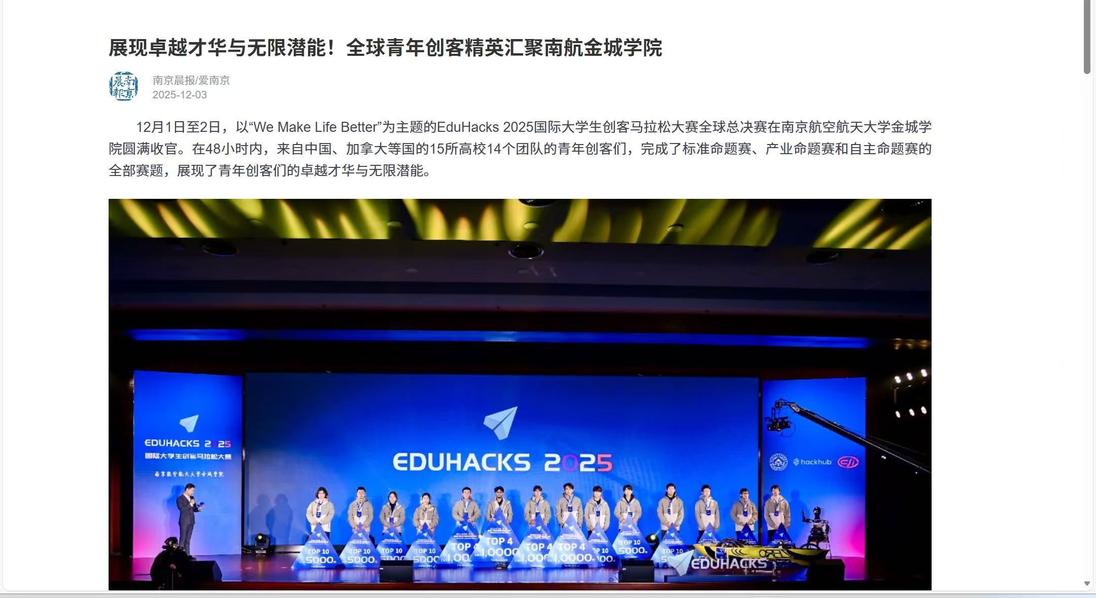 【南京晨报】EduHacks 2025圆满收官 |全球青年创客精英汇聚金城,多维赛道智创未来
