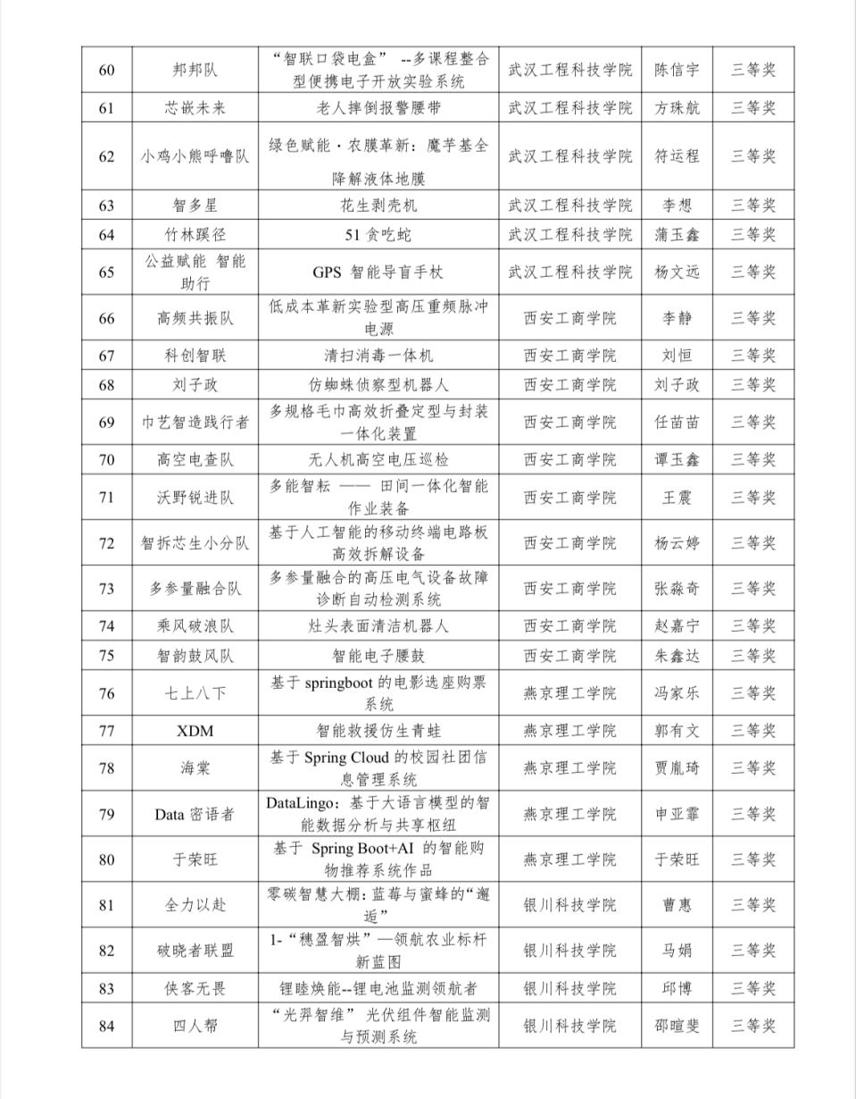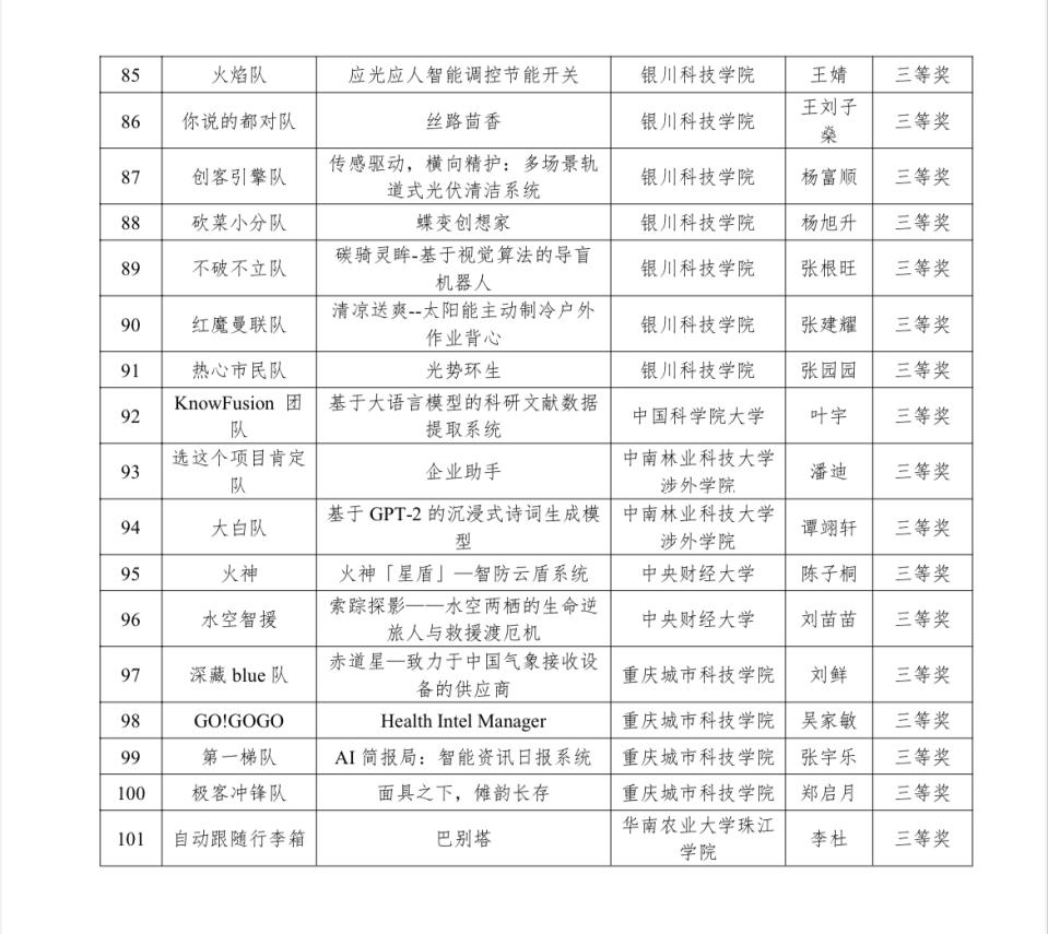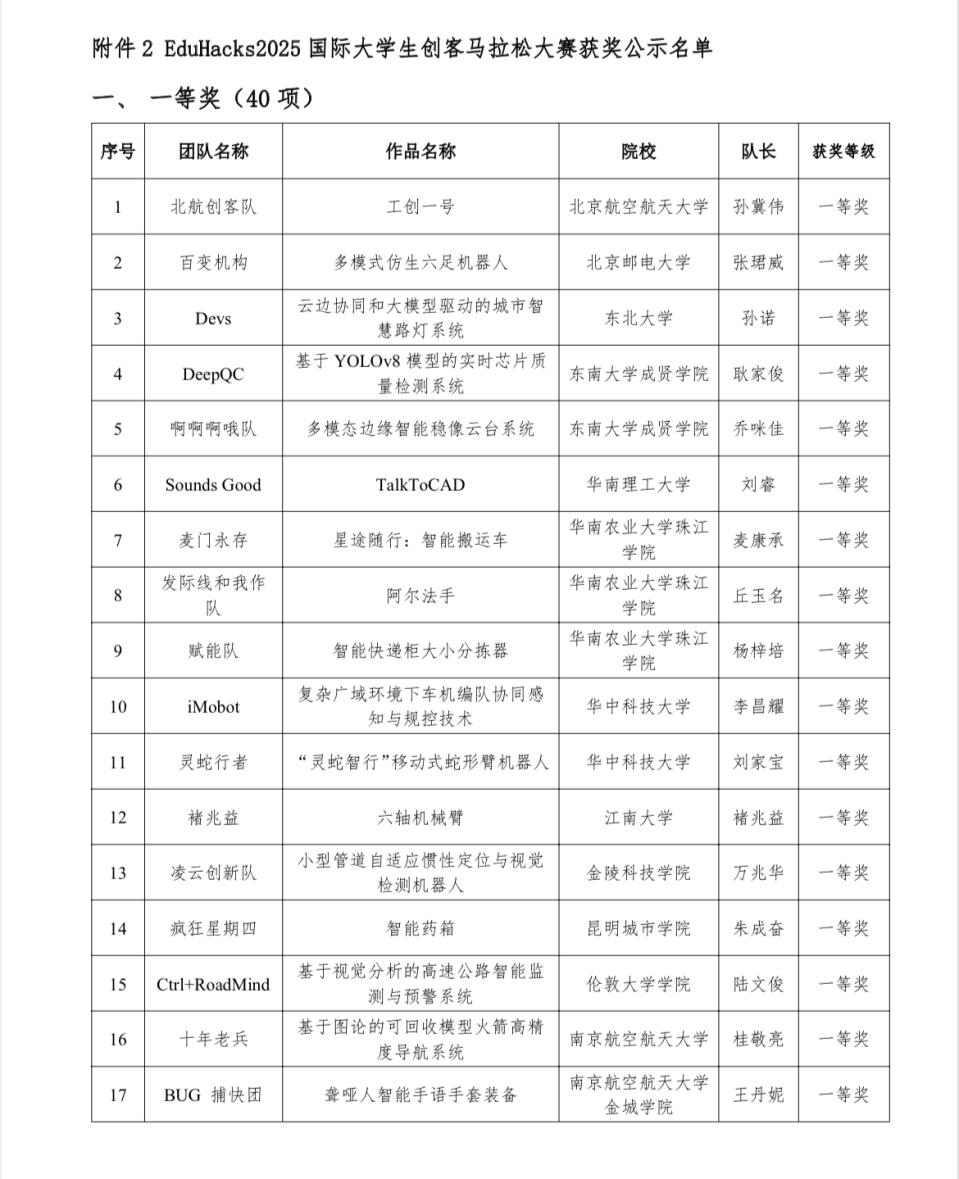 EduHacks 2025 国际大学生创客马拉松大赛评审委员会对 201 支国内选拔赛(复赛)参赛队伍按照评审规则,最终评选出一等奖 40 项,二等奖 60 项,三等奖 101 项。在全球对抗总决赛中,评审委员会对 12 支参赛队在标准命题、自主命题和产业命题三个赛程中作品评审,按照评审规则,最终评选出金奖 4 项,银奖 8 项,共 12 项。现将全球对抗总决赛结果公示,见附件 1(排名不分先后);国内选拔赛结果,见附件 2(排名不分先后)。