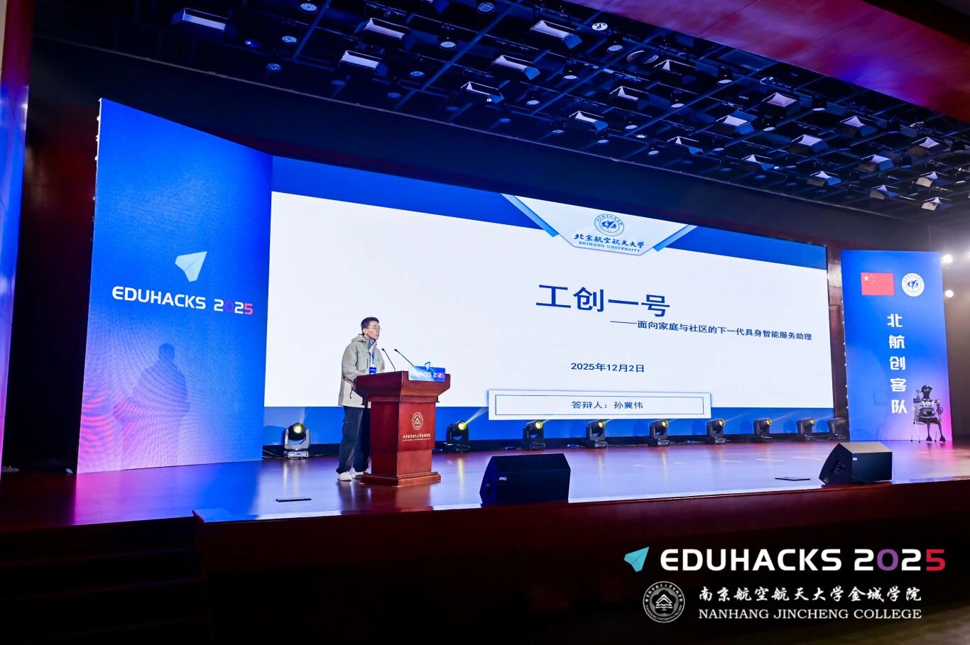 北京航空航天大学代表队的孙冀伟同学以“工创一号——面向家庭与社区的下一代具身智能服务助理”为题路演自主命题。该项目致力于降低成本,打造百姓买得起、用得上的生活助手,让高端科技服务于社区养老、智慧配送及零售等多元场景。